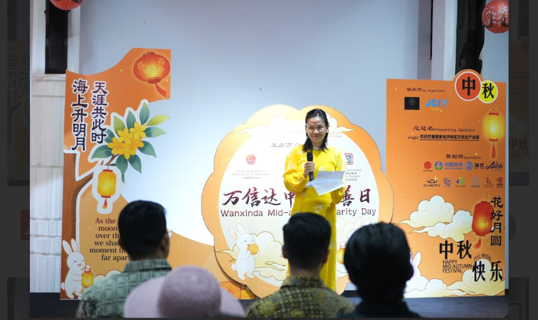作为本次慈善活动冠名“万信达中秋慈善日”的主要赞助商:印尼巴塘国家经济特区万信达产业园创始人陈日铃夫人金菊萍应邀上台致辞,她说:“慈善,是人类情感中最质朴、也最崇高的表达;它超越国界,连接心灵,是我们共同的精神纽带。