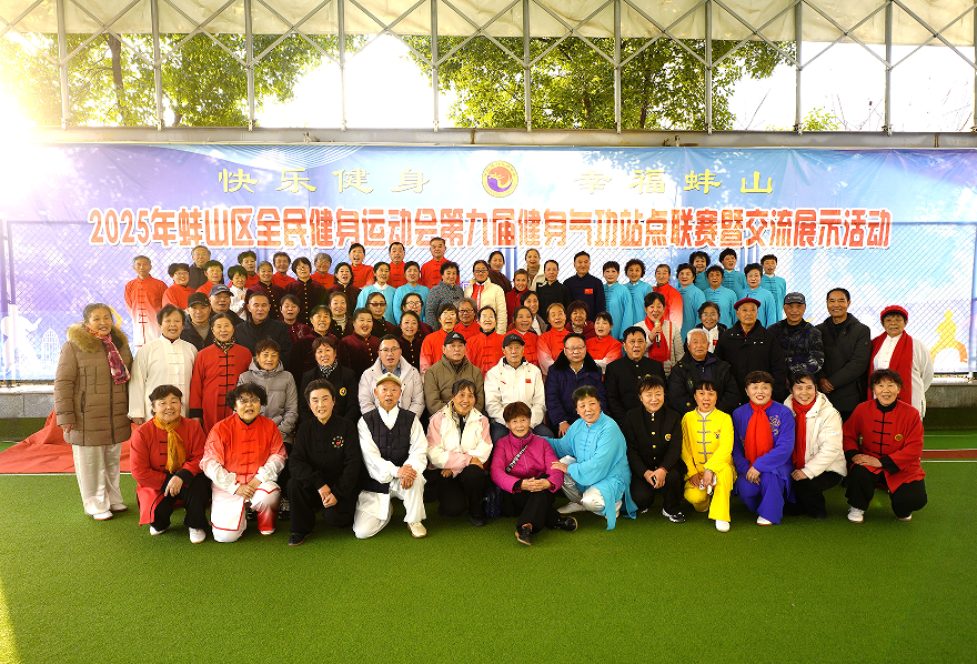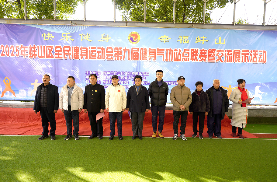 冬阳暖照,气蕴赛场。12 月 29 日下午,蚌埠市人民体育场内旌旗飘扬、气韵盎然,由蚌山区文化旅游体育局主办,蚌山区健身气功协会承办,蚌埠市老年人体育协会、蚌埠市门球协会、全民优生活蚌埠营运中心协办的 2025 年蚌山区全民健身运动会暨第九届健身气功站点联赛隆重举行。来自全区 30个站点的 600 余名健身气功爱好者齐聚一堂,以拳为媒、以气会友,在一招一式中传承中华传统文化,在动静之间彰显全民健身活力。